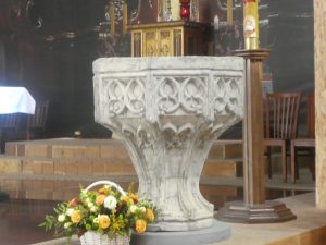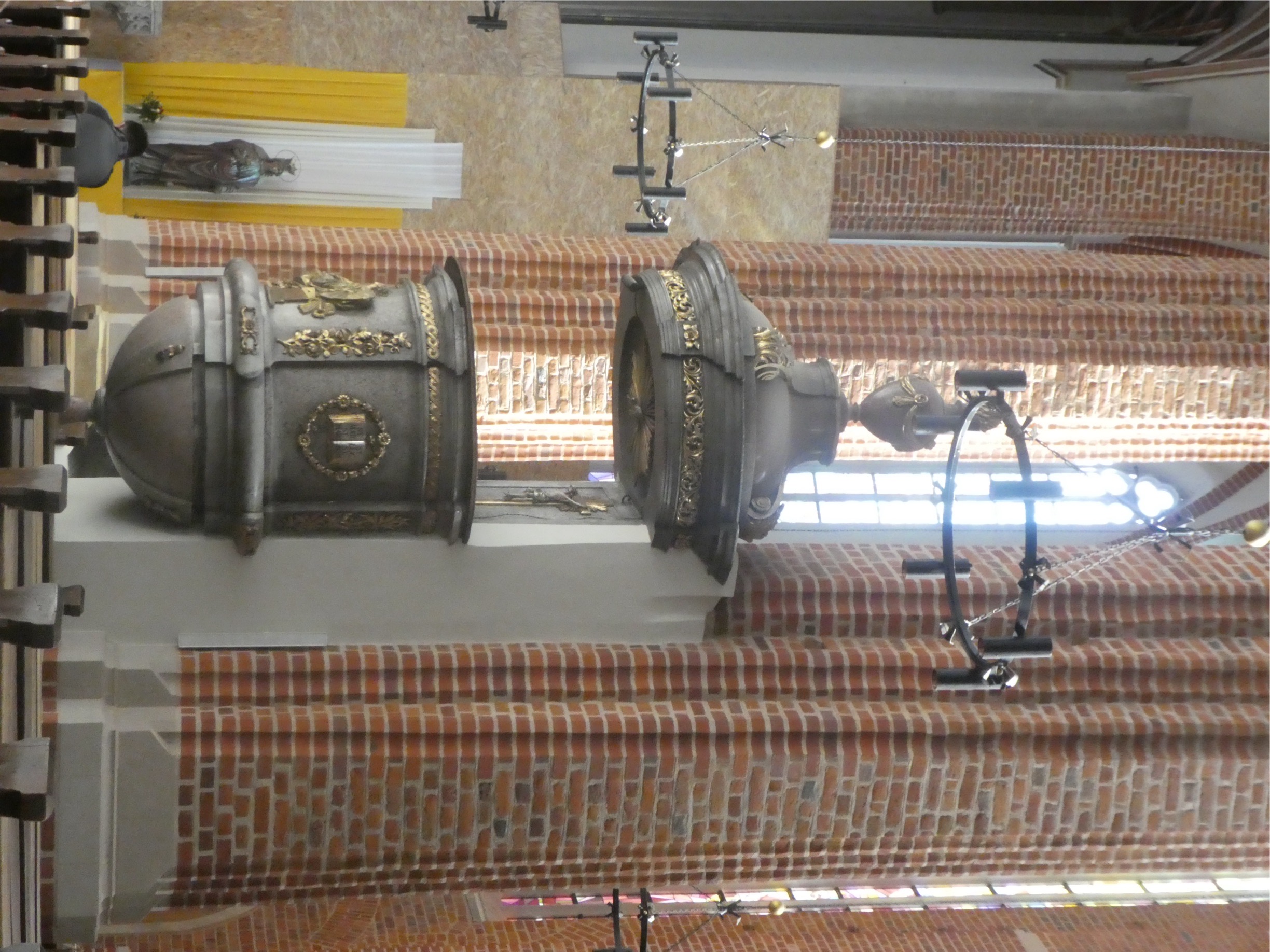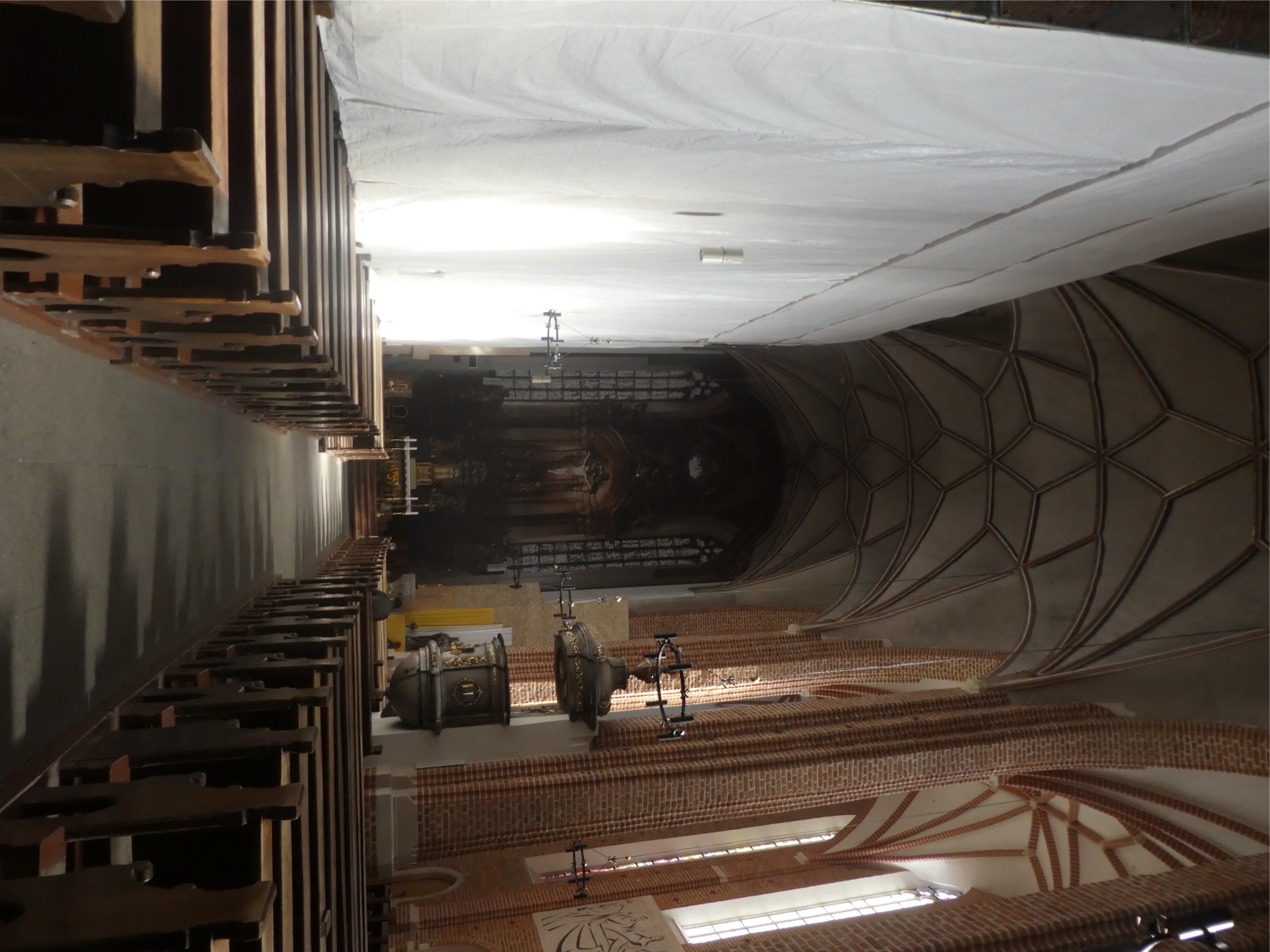 The main nave, with the size of the current restoration project visible from the work on the left hand side of the church. The restoration has the exciting aim of removing heavy layers of plaster which for centuries have covered the brick walls. This “regothicisation” has the aim of returning the building back to its medieval origins, showing the original fittings which were in the brick walls.