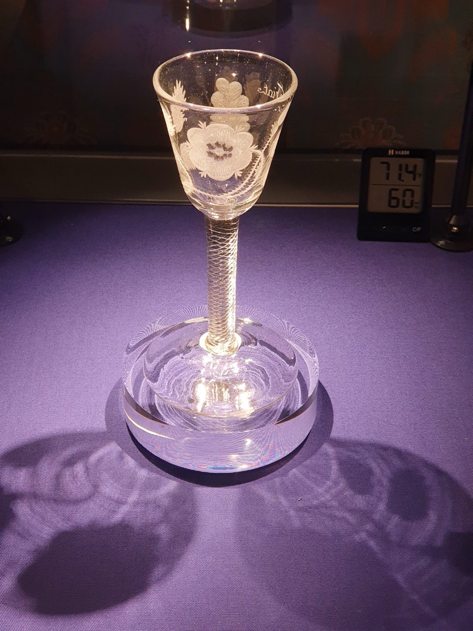 The glasses were probably made in the 1750s, when it was prohibited for anyone in the country to drink to the health of the Stuarts. So, the glasses were made with hidden messages such as the rose and twin buds, which were meant to represent James Francis Edward Stuart, along with the inscribed ‘fiat’, meaning ‘let it come to pass’.