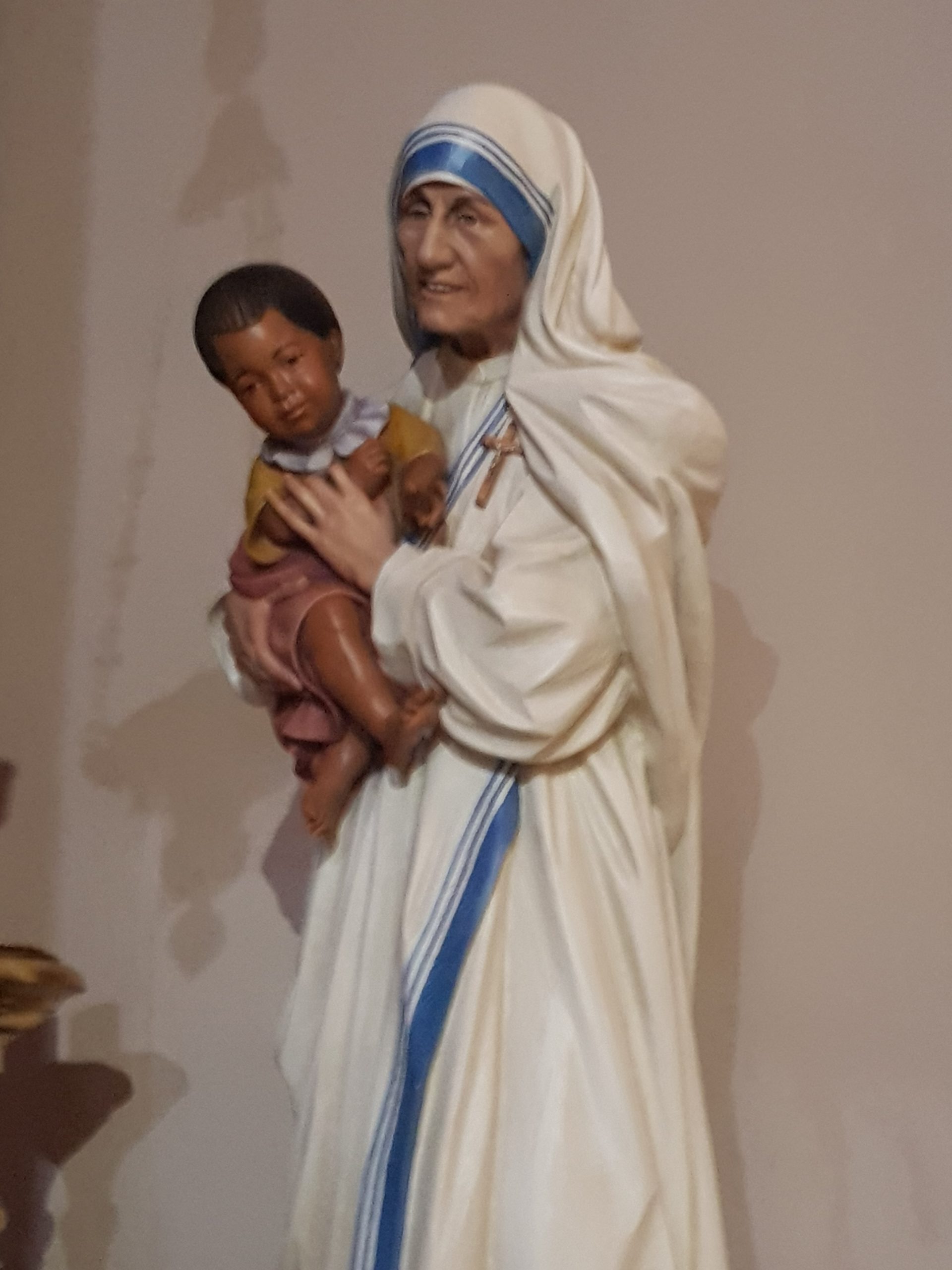 A polychrome statue of, I assume, Mother Teresa. There was another statue near to the entrance of Pope John Paul II and this was quite impactful.