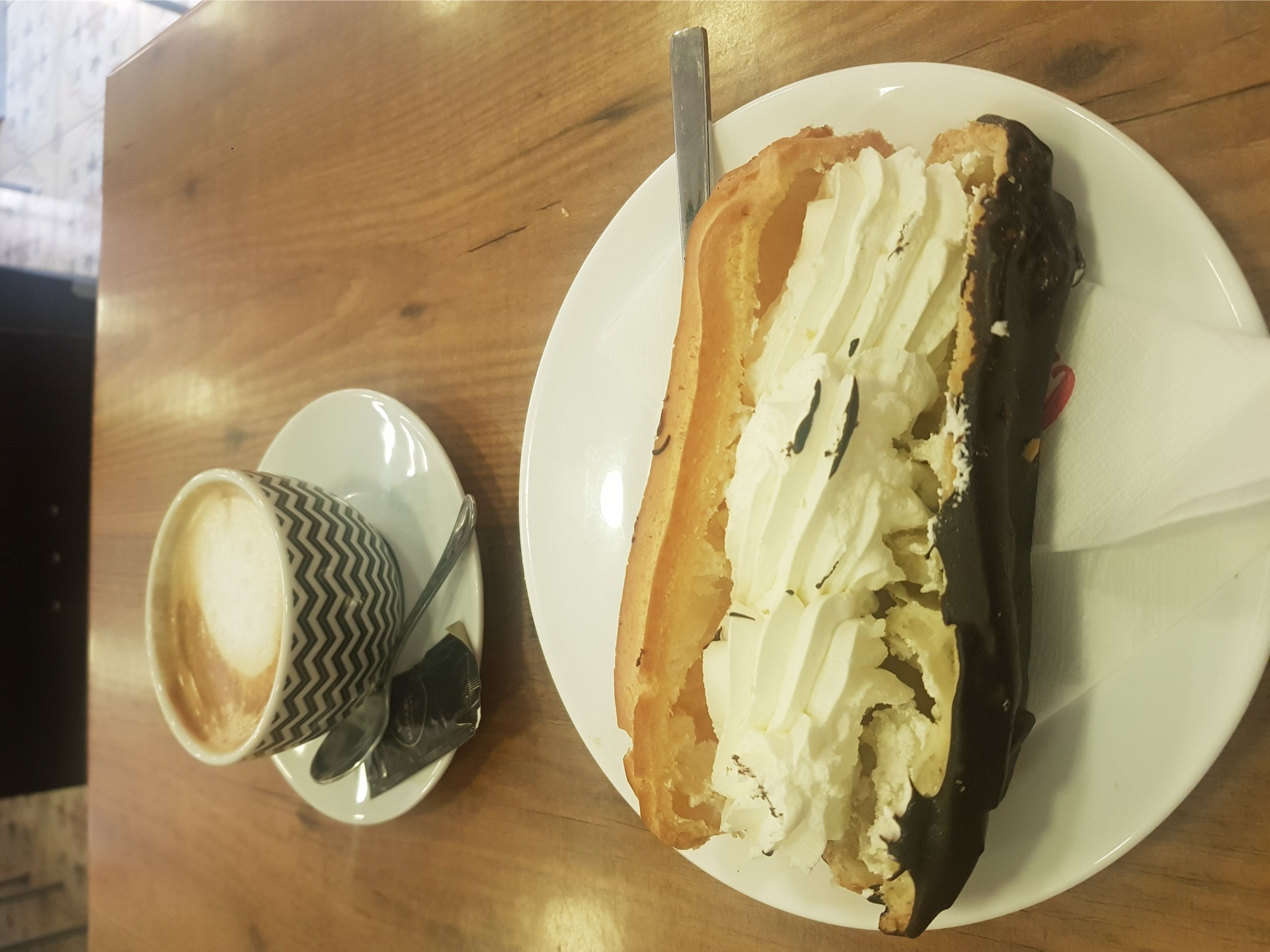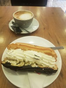 This was keenly priced, something just under £3 for the eclair and coffee, and the coffee was entirely acceptable with a suitable mildly bitter flavour. The eclair was generously filled with cream and that element was delicious, although it wasn’t as fresh as it could have been so the pastry was quite firm, but the tastes were there, so I willingly forgave them.