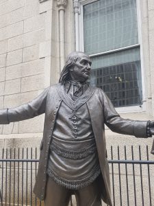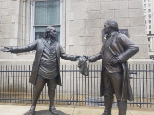 “When Benjamin Franklin first went to France as a diplomat, he was highly influential and successful in securing a French Alliance in support for the American War of Independence. George Washington, at that time, was serving as Commander in Chief of the Continental Army of the American Revolution. Gilbert du Montier Lafayette, who led the French troops, gifted to George Washington, as a sign of solidarity, a ceremonial apron as a symbol of the bond between these two countries. The monumental statues sculpted by Jim West depict the moment at which George Washington presented that apron to Benjamin Franklin — an apron that is now displayed in the Grand Masonic Museum of Philadelphia, outside of which these statues stand.”