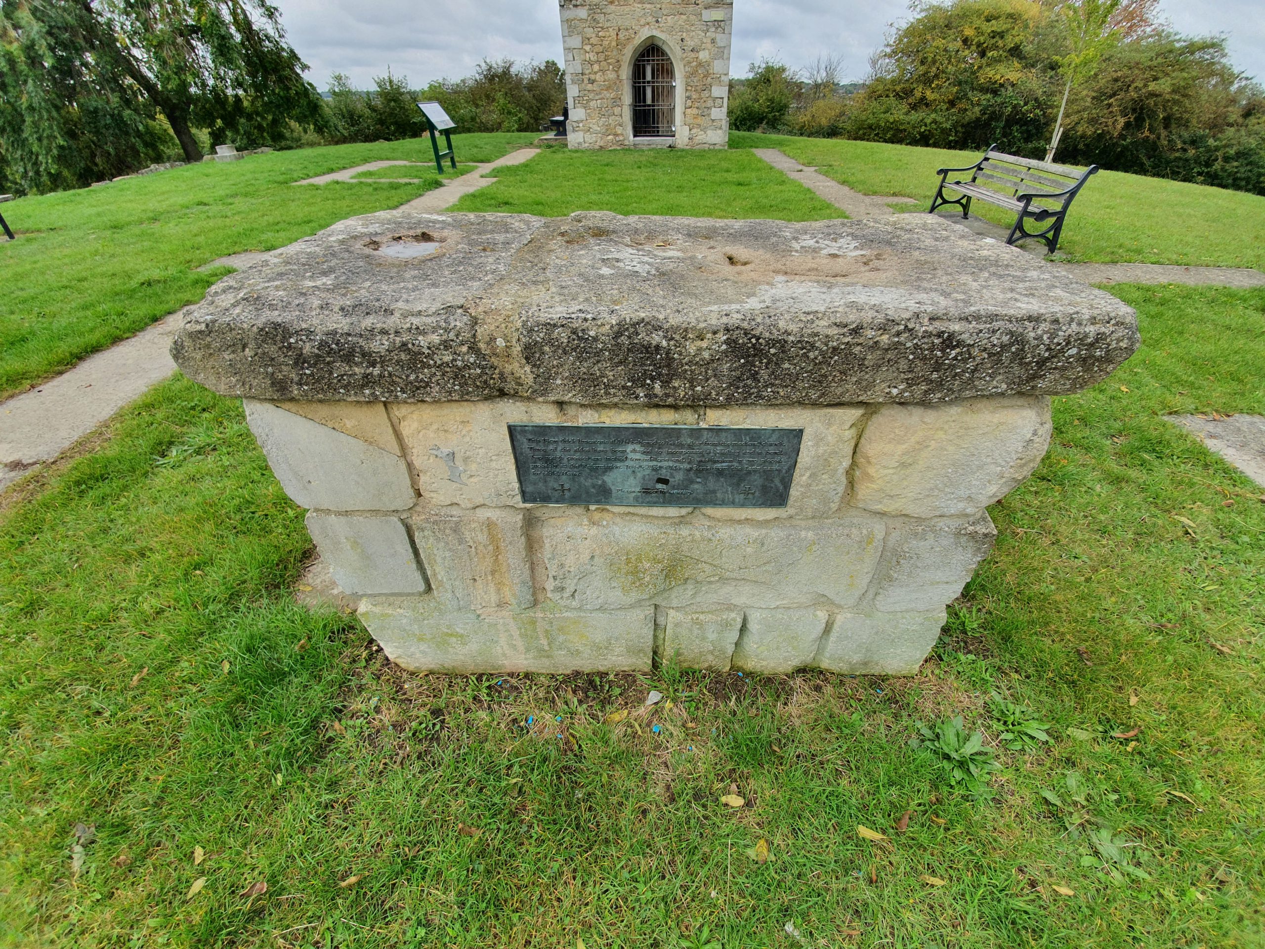 The outline of the church has been marked out in stone and this is the limestone slab which was thought to be the mediaeval altar. It was split into two pieces back in the Reformation and the stone is also known as a mensa (I had forgotten that, but it’s helpfully mentioned on the little plaque).