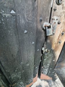 The door has been attacked by arsonists. Which is really likely why they had to knock the nave and chancel down, it was going to be attacked and be a bigger problem, a bit like the situation at St. Wandregesilius Church in Bixley.