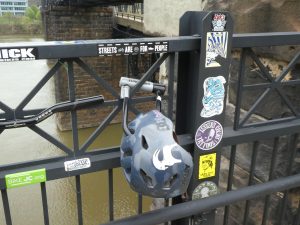 There were a few love locks on the bridges in Pittsburgh. However, I’ve never seen before a cycling helmet attached to a bike lock which is then placed on the bridge, in this case Hot Metal Bridge (a wonderful name for any structure). I thought for a while someone was storing it there, although that seemed unlikely, but there are numerous other rather more traditional locks in the area.