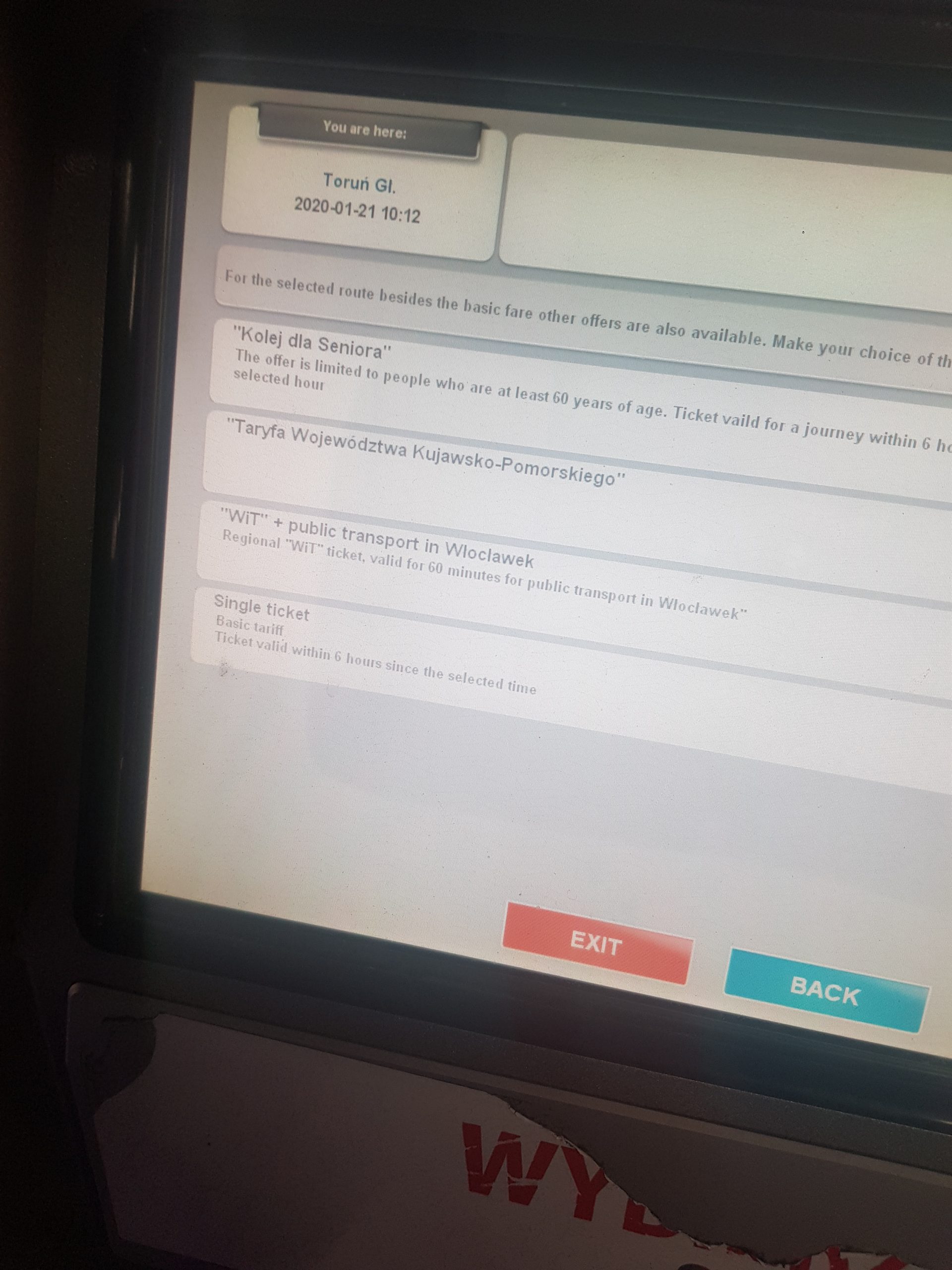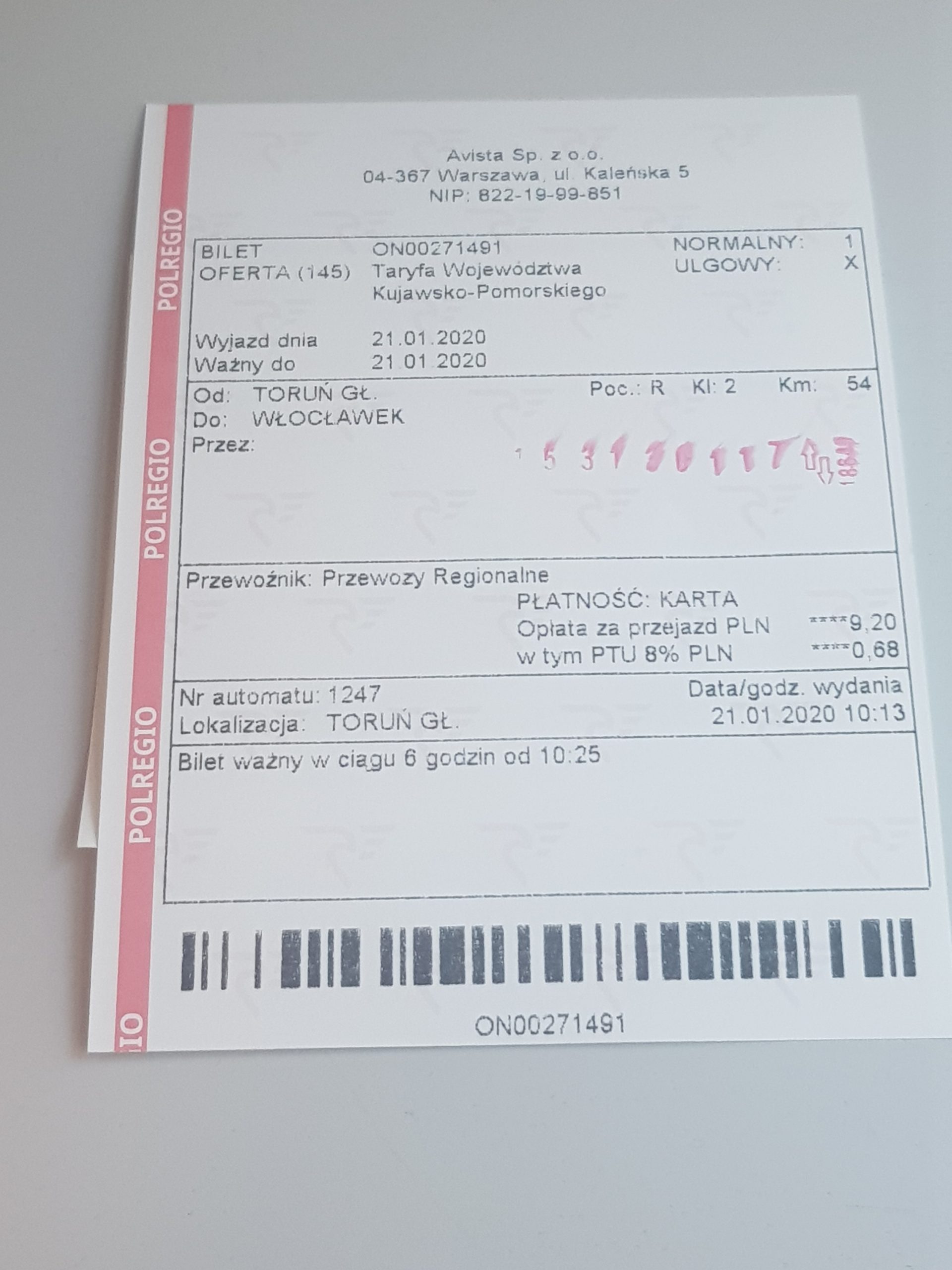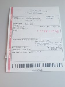 This confused me, in particular, the Taryfa Województwa Kujawsko-Pomorskiego option. I knew that was the region that both cities were in, but I was a little concerned that it was only available to local residents who held some card. I thought it might be safer to purchase the single ticket option, but that was more money, so I risked getting the cheaper fare. I’m not entirely reckless though, I Googled the ticket just before boarding and I was pleased that it wasn’t a kid’s ticket that I’d bought.