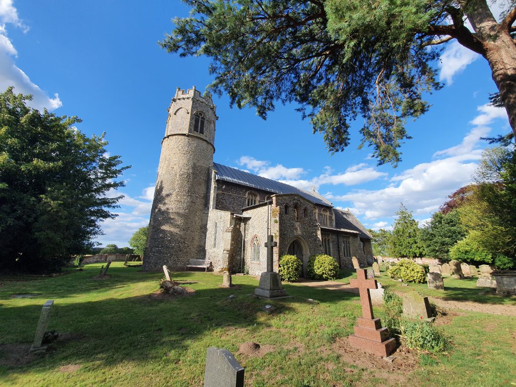 I still struggle to think of Potter Heigham without linking it to Latham’s and their memorable radio ads, but this church is a little way from there and in a relatively peaceful countryside spot. It dates from the twelfth century, although the nave was substantially remodelled in the early sixteenth century. The round tower has some heritage, probably twelfth century but perhaps as early as the eleventh century, with some Norman elements visible in the main structure of the tower and church.