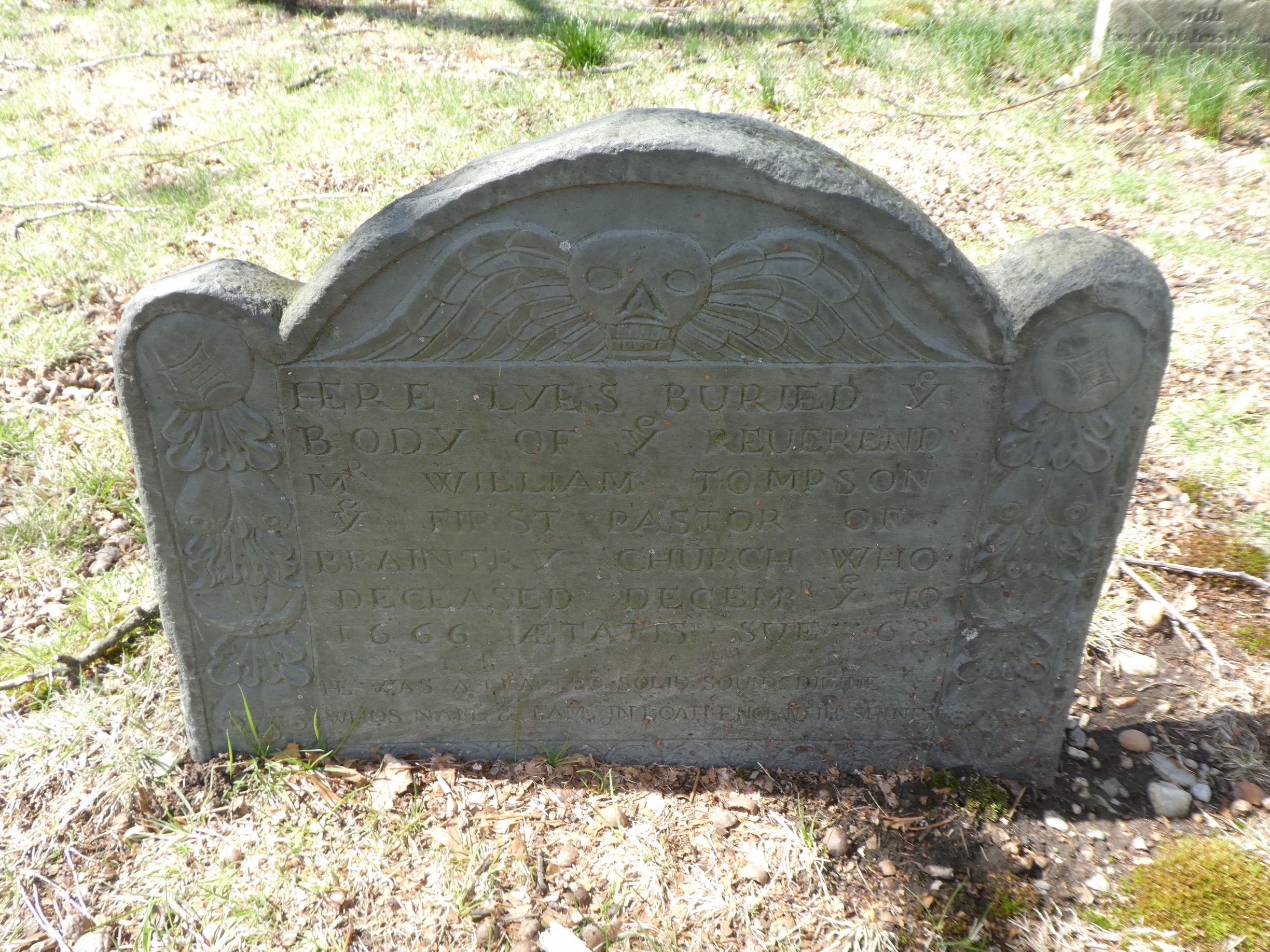 Tompson’s son, Benjamin Tompson, is known as the first American poet and he was born in Braintree (which was later divided into two areas, one of which is Quincy) in July 1642 and he was educated at Harvard College. He died in April 1714 at the age of 71 and is buried in Roxbury, just to the south of Boston.
