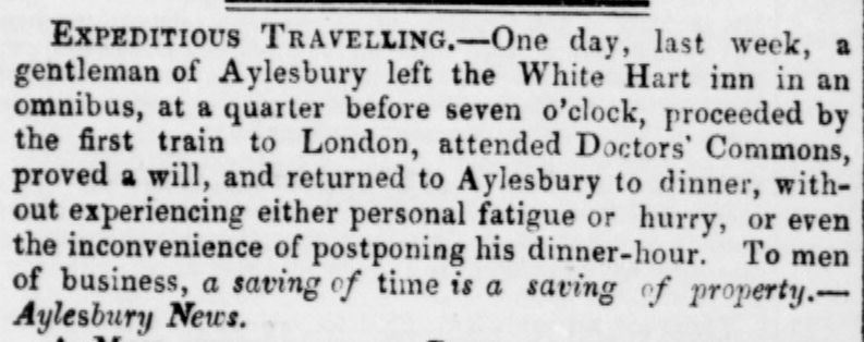 “One day, last week, a gentleman of Aylesbury left the White Hart inn in an omnibus, at a quarter before seven o’clock, proceeded by the first train to London, attended Doctors’ Commons, proved a will, and returned to Aylesbury to dinner, without experiencing either personal fatigue or hurry, or even the inconvenience of postponing his dinner-hour. To men of business, a saving of time is a saving of property.”