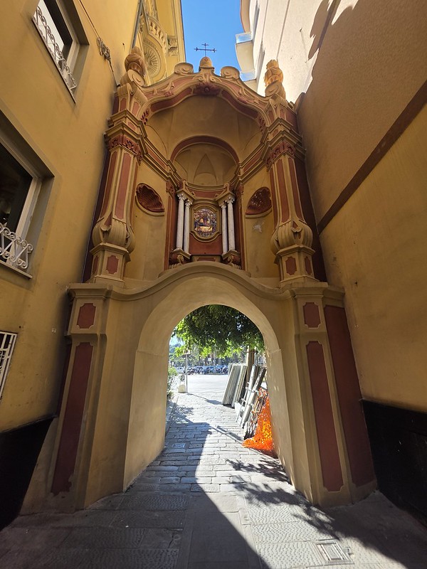 This pretty little gate is the only surviving one of the five that once circled the town of Rapallo. The gate was constructed in the early seventeenth century, although the rather decadent Baroque style is more recent. I imagine that the town authorities had a bit of money one year and fancied tarting it up, perhaps because they’d already knocked the other four down. The destruction of the gates started early, as one was taken down in 1702 to improve access to the town.