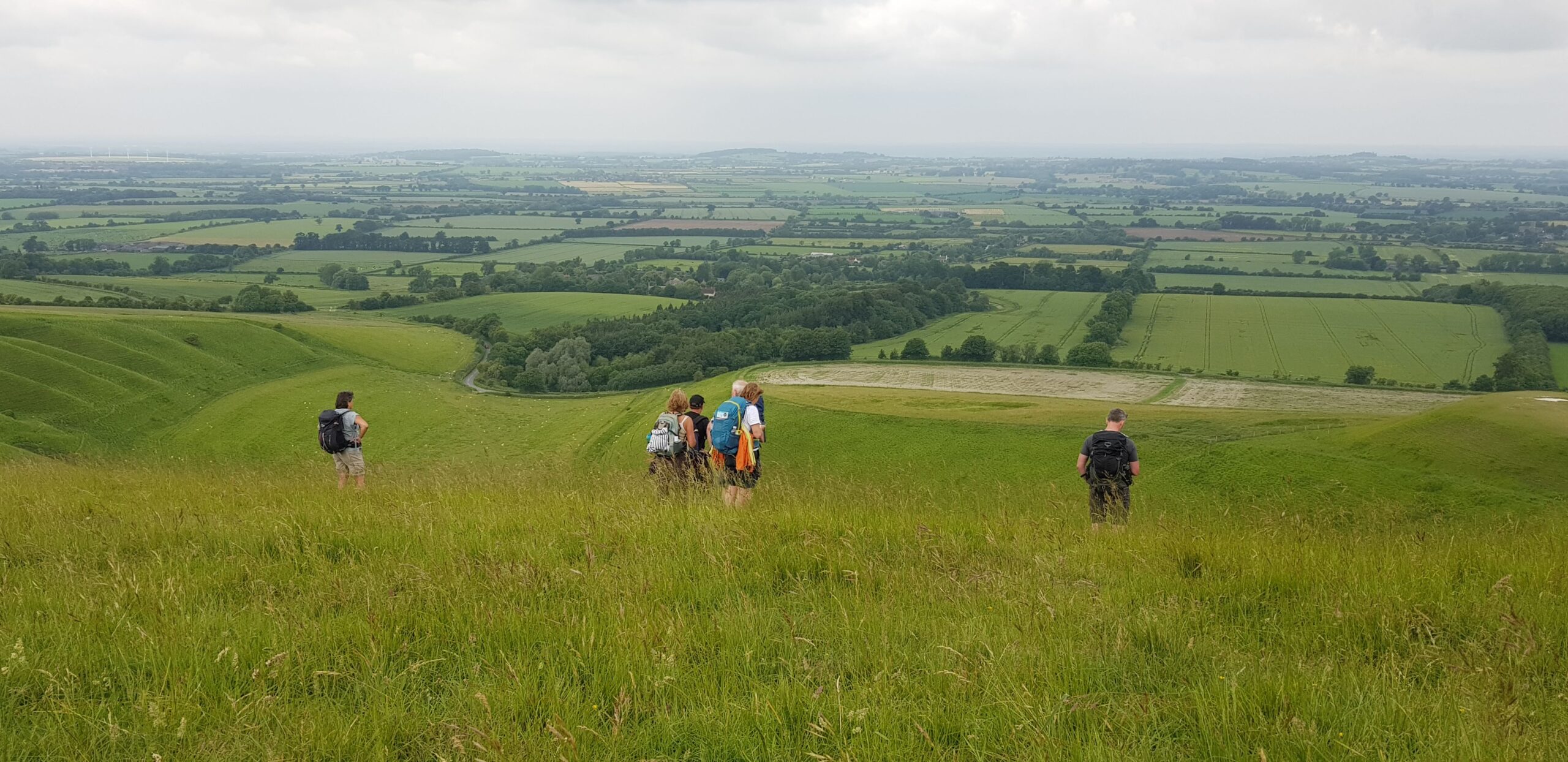 Towards the end of the day’s walk we reached the site of Uffington Castle, which is an old iron age fort. Also there is the Uffington White Horse, the largest chalk figure in the UK which is over 3,000 years old and Dragon Hill.