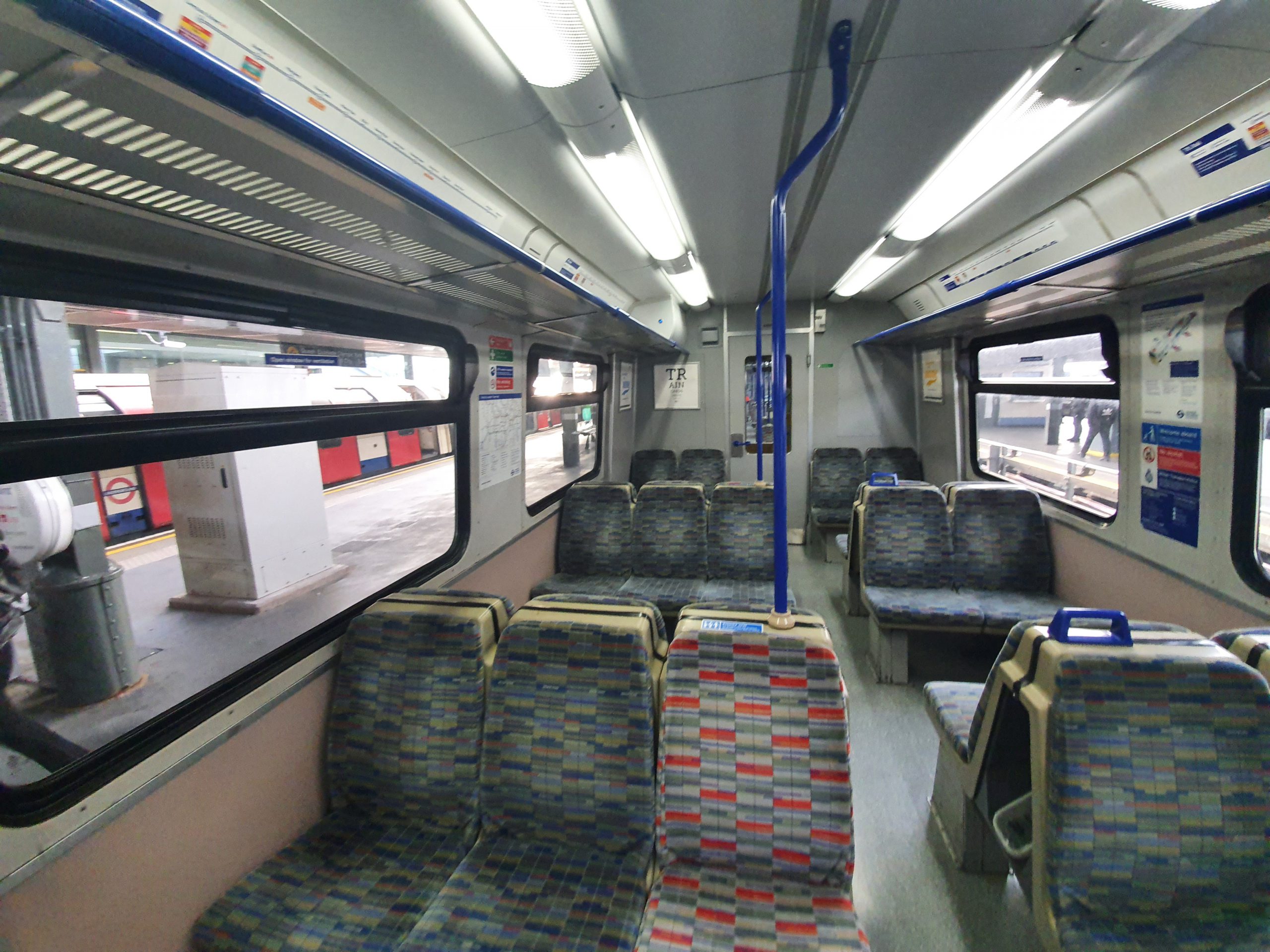 Inside the train, which has frankly seen better days. I’m not very good at train recognition, but I think it’s a Class 315, which were built by British Rail (when they weren’t busy closing stations) in 1980. The train was six minutes late in arriving, but there are trains every ten minutes, so it doesn’t make much difference. The train got busier as we got nearer to London.