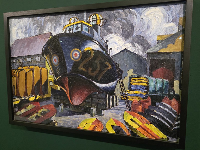 That, really, is the theme that justifies this riveting blog post, which is that the war depended on rescue, repair and the sort of practical work that rarely gets turned into legend. The museum panel notes that this was one of seven paintings Andrews made about boat building while attached to the Camouflage Development and Training Centre at Farnham Castle under the War Artists Advisory Committee, and that she was working for the Royal Air Force as an official war artist. I like it when infrastructure is at the centre, there are enough artworks of moments of great rescue at sea or of battle scenes.