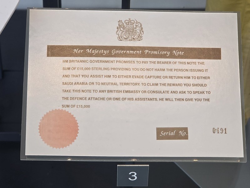 I’d never much thought about this (like many things) but this is a promissory note that service personnel fighting in the first Gulf War were issued with. If anyone was shot down or otherwise caught in enemy territory, then the Foreign Office would give £15,000 to anyone who returned them to safety. They each have a serial number so that they could be verified.