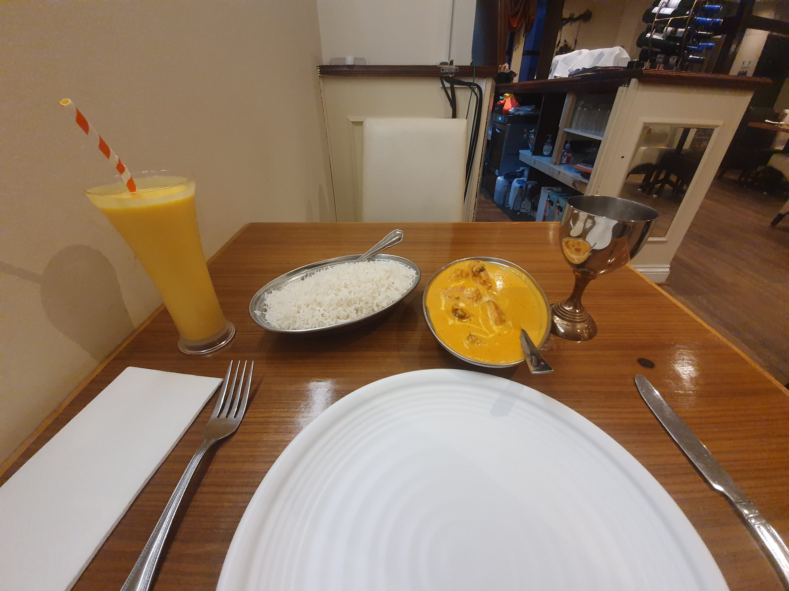 The wide angle of the photo has rather distorted this, as the portion size was much more generous that it looks here, although the plate wasn’t as large as it looks. The butter chicken was served as a reasonable portion and it had large pieces of chicken which were moist and tender. The sauce was rich and had a pleasant taste, a very good dish. It wasn’t spicy, which is as I would expect, although there was a depth of flavour, which puzzled me since the server had earlier asked if I wanted a recommendation of a spicy dish. The rice was served as a portion that was a bit big for me on my own, but such is the difficulty of being a sole diner and I did manage it all…..