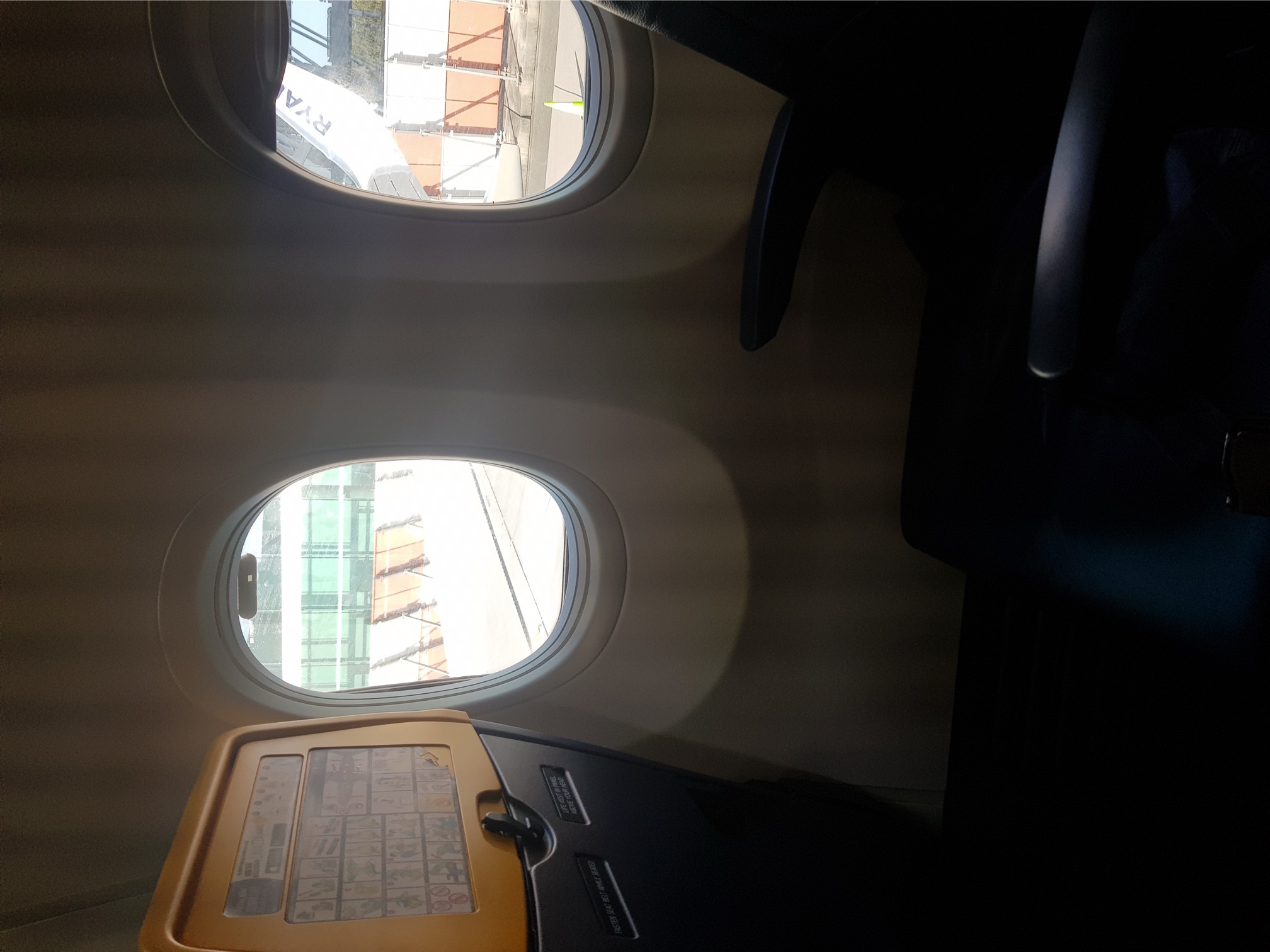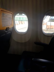 The seating on board, which was clean and sufficiently spacious given that this is a budget airline. I had been automatically allocated an aisle seat for free (woooo), with the other two passengers on this row arriving soon after I took the photo.