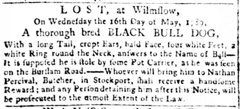 I can’t tell, but I suspect this is Nathan’s father of the same name, and same occupation, who managed to lose his black bulldog in Wilmslow. Nathan’s father’s will survives and he gave his three children an equal share of his wealth, but his business property which was left to him by his brother William was split between Nathan and John. The will mentions that the older Nathan Percival lived in Churchgate, although I’m unsure if that’s where he traded as a butcher. Unfortunately, the earliest trade directories on-line are a couple of years after the younger Nathan died, so I can’t get a location.