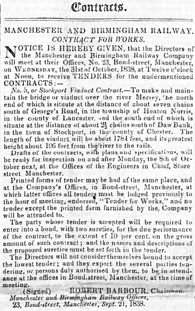 The original tender document, which must have been something of an intimidating challenge for any company interested in bidding. By March 1839, the newspapers were reporting that the first stones had been placed and work was well underway. In June 1839, the debate started about the plan to save money by reducing the Congleton viaduct by 20 feet and raising the Stockport viaduct by 13 feet at one end, which was opposed by some but ultimately permitted. By November 1839, eight of the twenty-two arches had been completed and the ninth, crossing Heaton Lane, was about to be finished. Just a few weeks later, the flood mentioned earlier caused massive damage to some of the works, but they soon replaced all the damaged wooden support scaffolding. The local media were proud of the project and reported frequently on how works was progressing. By September 1840, the Liverpool Standard and General Commercial Advertiser, reported that:
