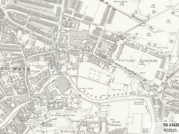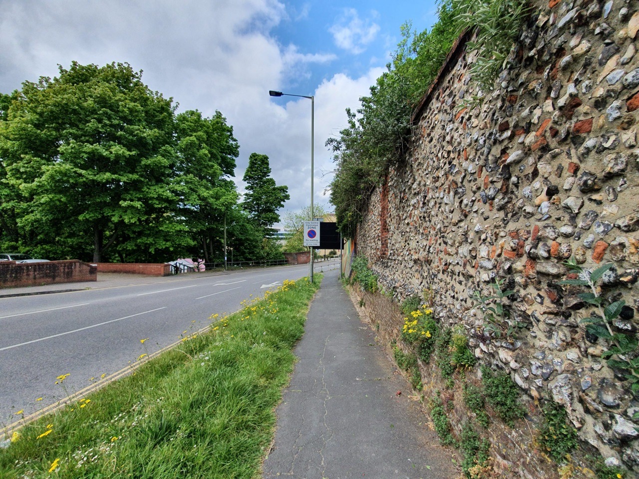 And, this was a former entrance to the barrack buildings, although it has been landscaped so there’s now nothing behind here other than soil. It’s also where the entrance to Hassett House would have been, and for a period of time, the tower over the other side of the Wensum River was known now as Cow Tower, but as Hassett Tower.