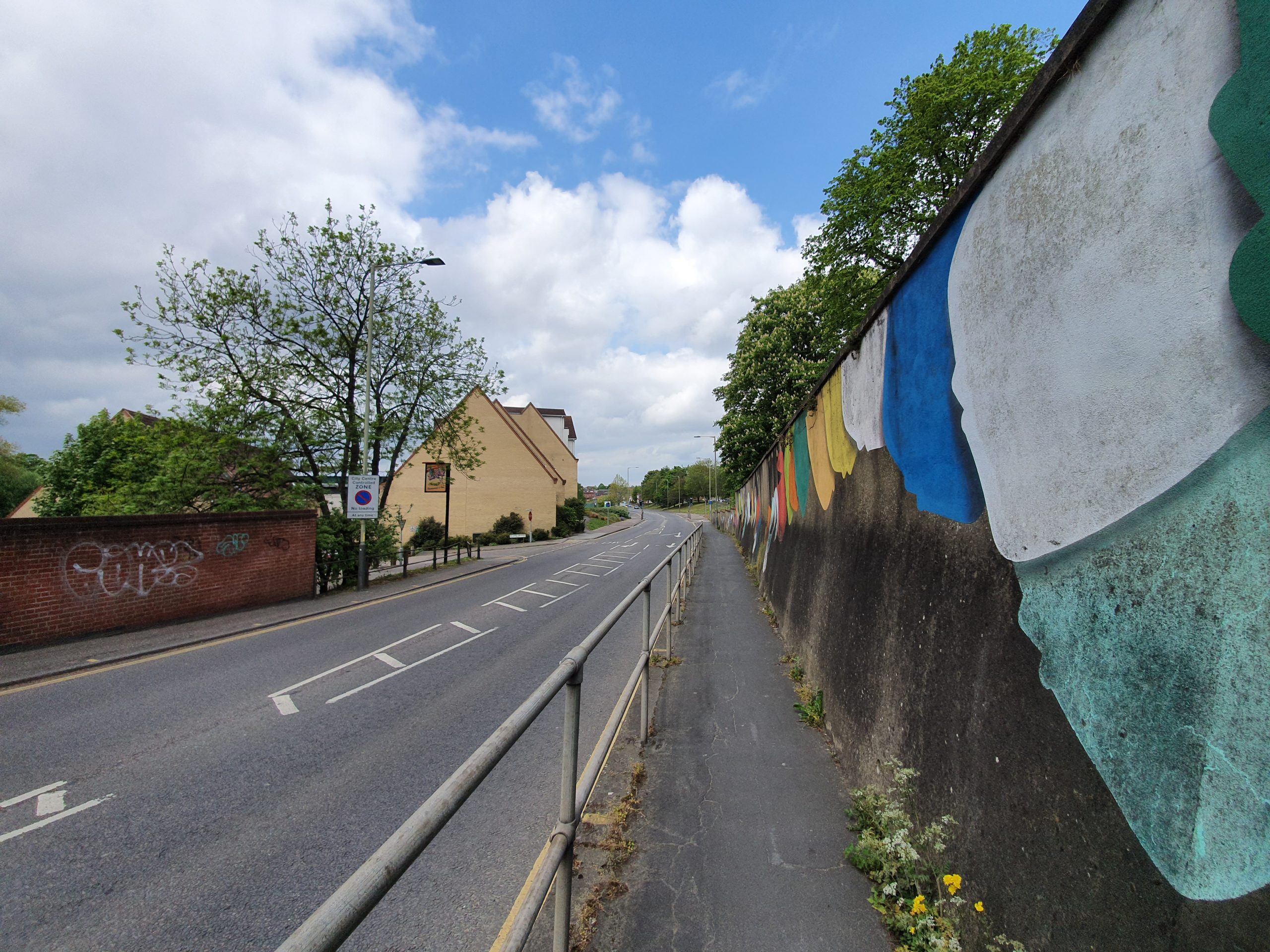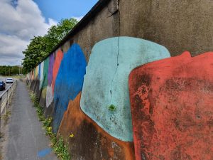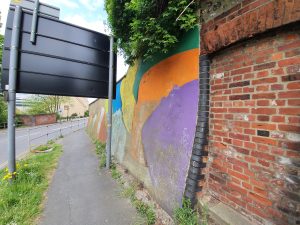 A pretty mundane looking wall which has been brightened, or worsened depending on your point of view, with some paint.