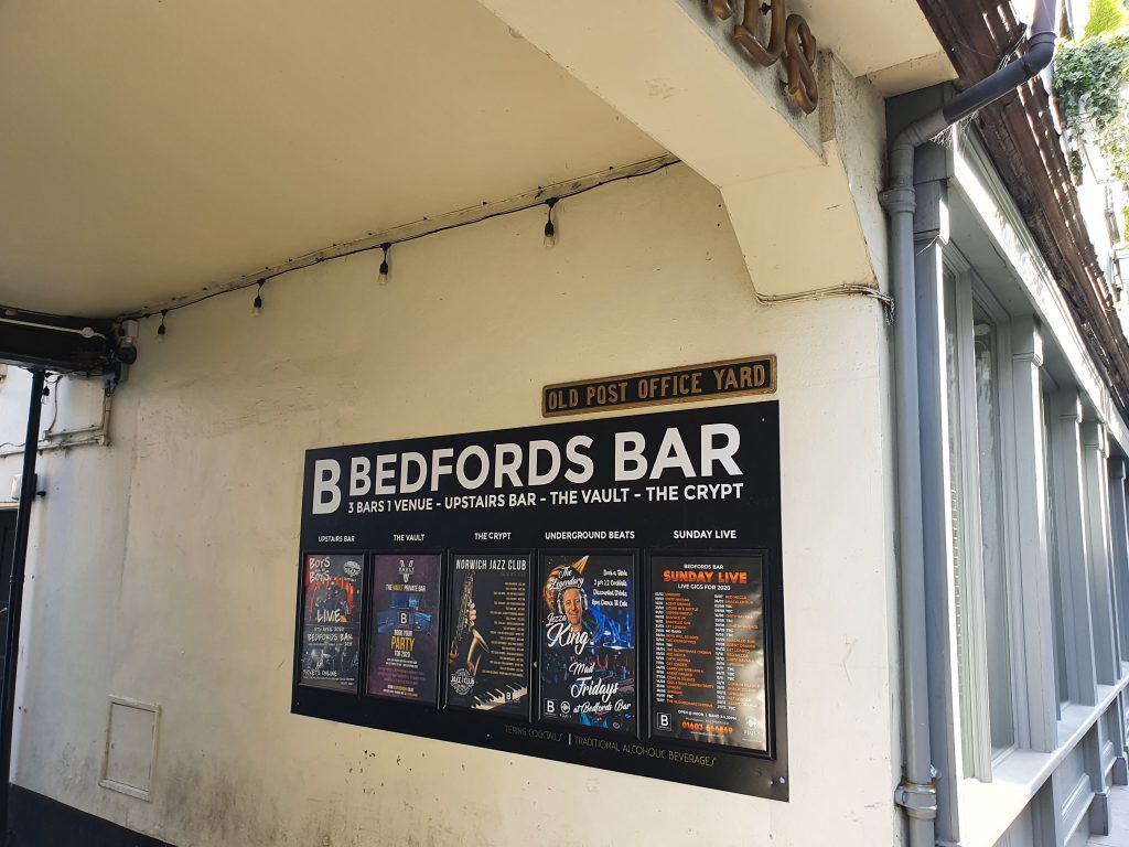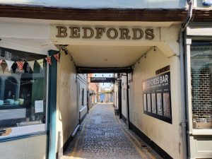 The building on the left-hand side of the arch was once the Nelson Tavern, with Bedfords Bar being on the other side to this. There was a Bedford Arms, but that was further down Bedford Street. The Norfolk Pubs web-site mentions that the Nelson Tavern was in operation from the mid-nineteenth century until it was closed down in 1918, during the period when the Government wanted to cut down on the number of licensed premises. It was also known, quite ridiculously perhaps, as the Pink Dominoes in 1881 (that’s almost a gastropub name from today) and as Klondyke towards the end of its existence as a pub. History often comes full circle though and it’s now a licensed premises once again, known as Frank’s Bar.
