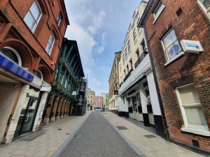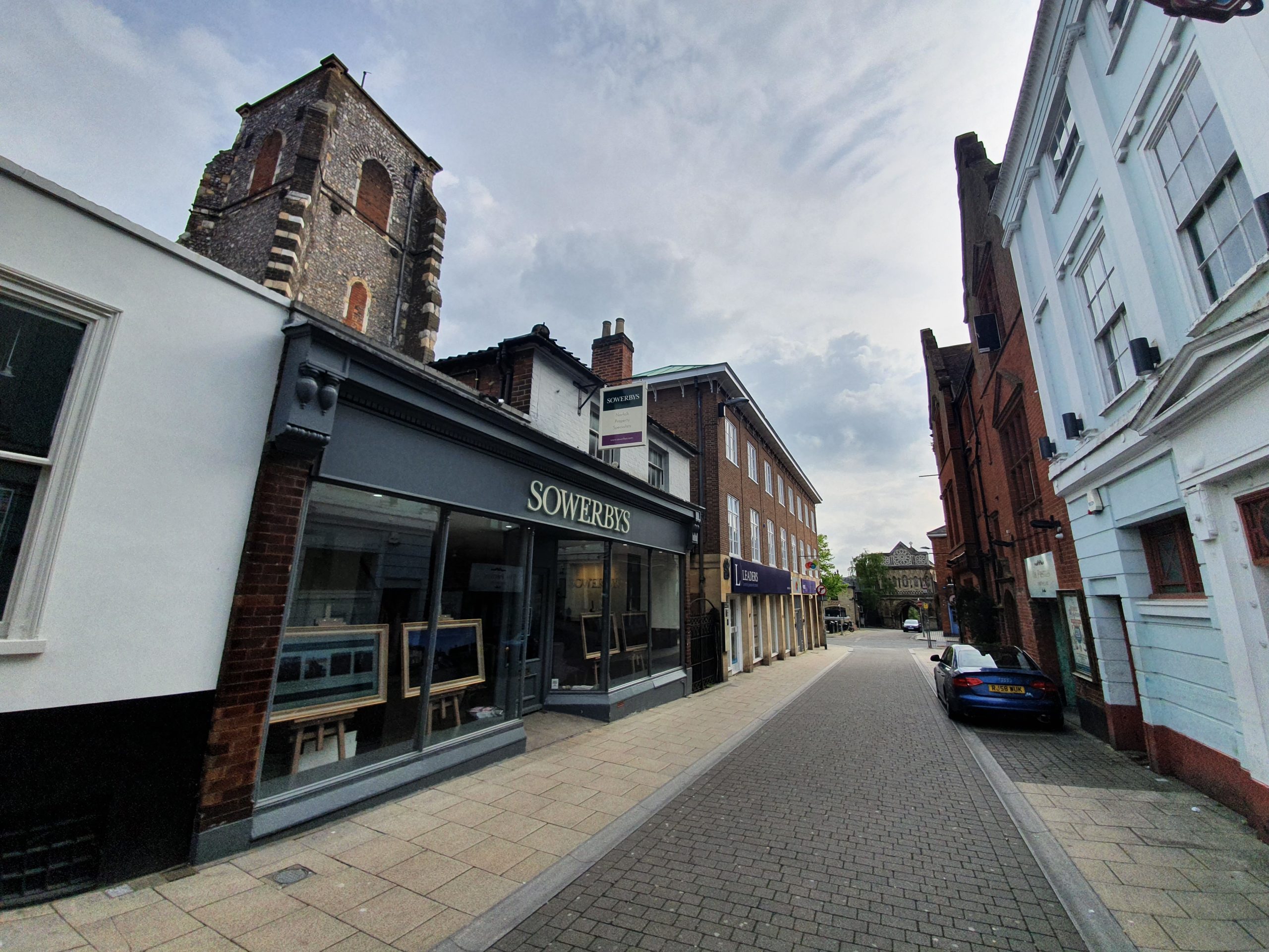 Looking back down Queen Street towards the Ethelbert Gateway, with the Church of St. Mary the Less visible on the left-hand side.