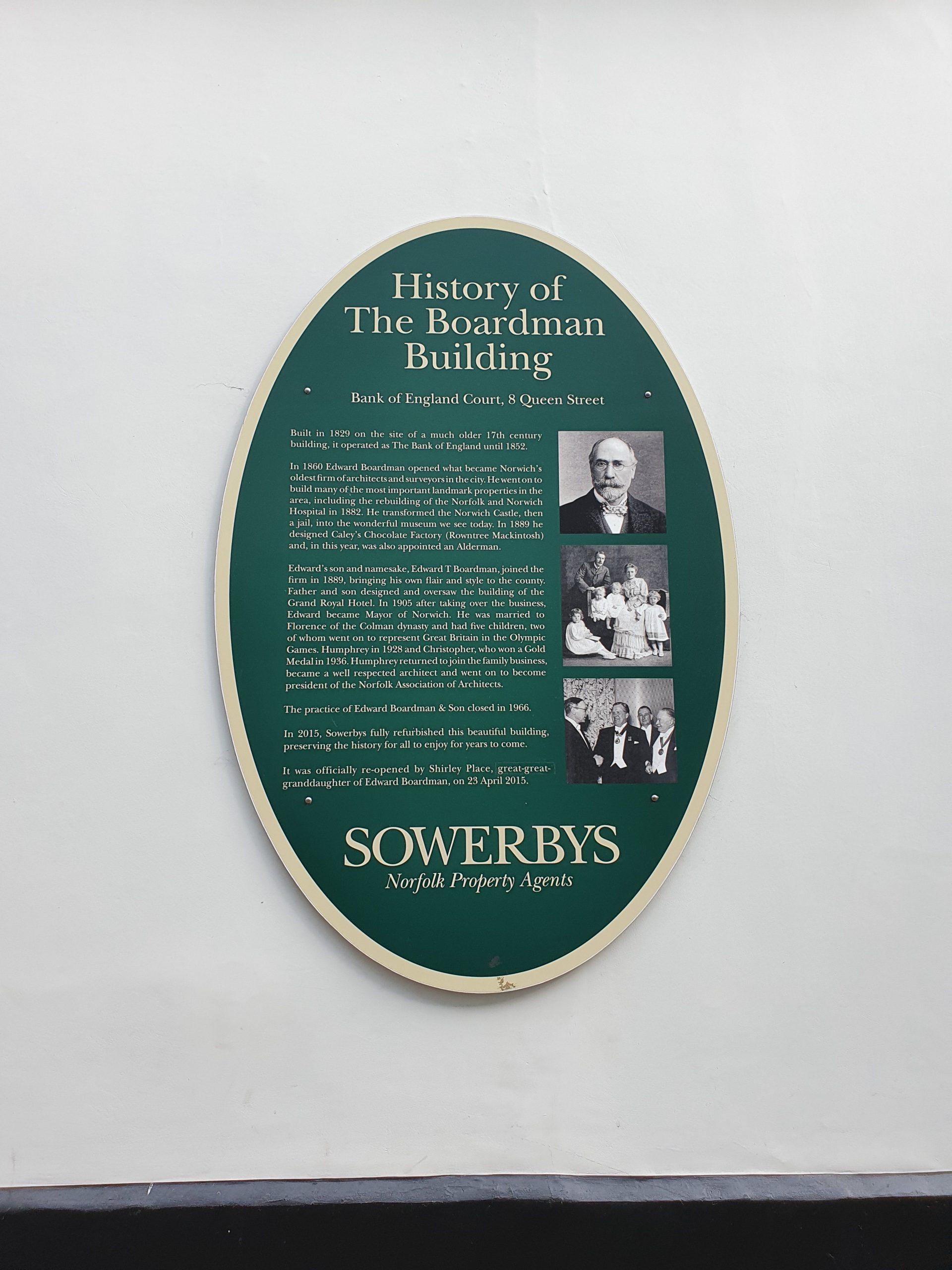 This is handy at the Boardman Building at the Bank of England Court (which is a different location to the nearby Boardman House), the history of a building on a panel at the front. More places should do this.