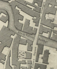 This was historically a built-up area of the street, but is now St. George’s Green. Near to the river, the Blackfriars Tavern was a pub which traded between the mid-eighteenth century until its final closure in 1911. It was also known as the Cellar House and the Friars Tavern, and probably overlooked the river.