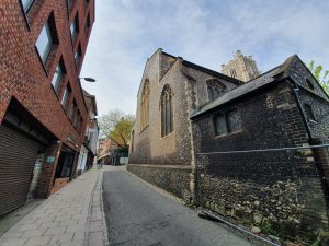 For some reason that I’ve never fathomed out, I’ve always liked this street, which is dominated by St. John the Baptist, Maddermarket Church and its sprawling churchyard. The name of the street is derived from the time that madder, which is a root that produced a red dye, was sold from the north end of the churchyard in the thirteenth century. From then on, the name has stuck and this street connects St. Andrew’s Street with Pottergate. More on the church in another post though…..
