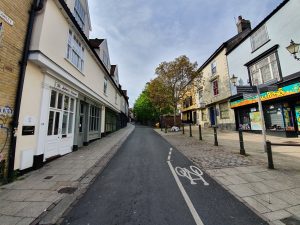 The building on the left is number 21-23, two buildings constructed in the seventeenth century which have been two separate shops for some time, with the left-hand side property having once been a pub.