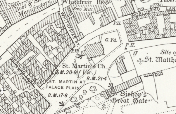 In the above map, St. Martin at Palace Plain covers part of the square, then the road down to where it looks like there is a pub in the middle of the road, before going up to another pub. Today, that is the entrance to the courts and the road and Worldsend Lane have all gone, so St. Martin at Palace Plain is effectively just the stump of road between the church and the entrance to the Bishop’s Great Gate and not that much further. Indeed, I’ve noticed that some properties have been moved out of St. Martin at Palace Plain on the listed buildings register and placed under other streets.