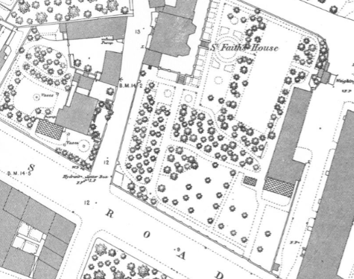 The location of Stuart Gardens was in 1880 a load of trees in the gardens behind St. Faith’s House. That property has long since been demolished (there is still a building with that name, but it’s on Mountergate), although at least a few trees remain because of the James Stuart Gardens that can be accessed from Recorder Road.