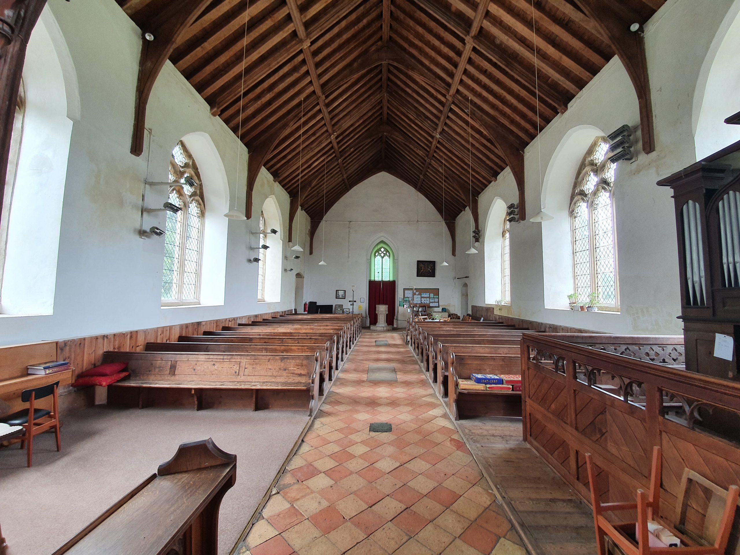 The interior is bright and well proportioned, with the fifteenth-century font being visible at the back of this photo.
