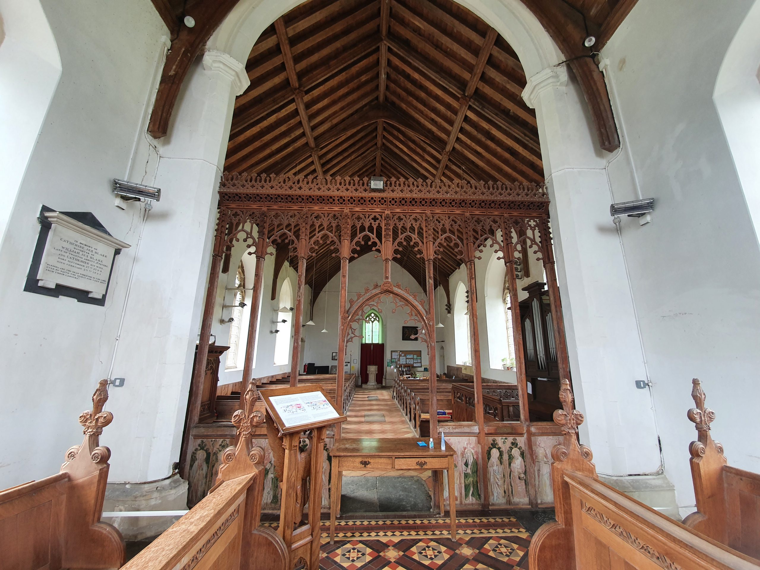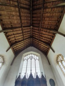 The chancel end of the church, with this grand wooden arch-braced roof dating to 1953.