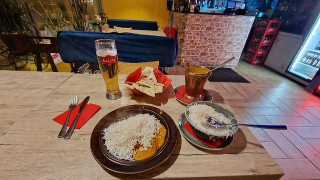 I did enjoy the meal, the entire bill for the curry, rice, naan and half a litre of beer came to around £15, so it was all reasonably priced and the portion sizes were generous. It’s the first time incidentally that I’ve been given a curry in a bucket like that, although it helped keep it warm given that the plate itself was cold. I think if I came again I might request that the curry be made with more spice, although it feels quite British to do that in some macho way. I think I stayed here for around two hours as I rather got distracted with my book (well, book on a phone) and the service was always personable and helpful, so I’d recommend it if asked (the restaurant, not my phone which to be honest is on its last legs).