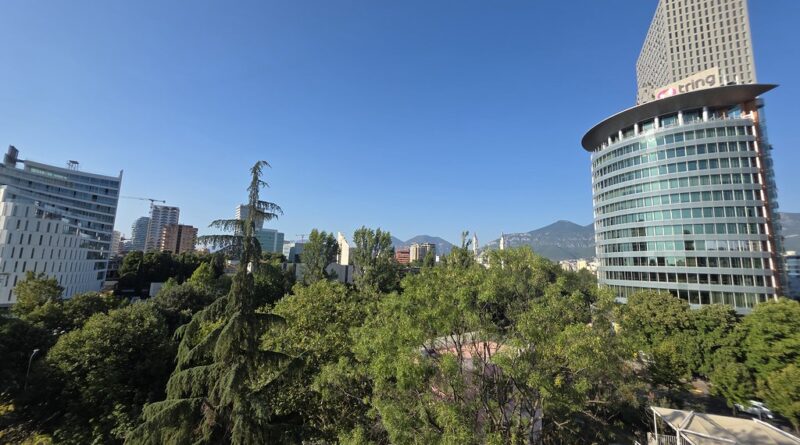 On the left is the Bank of Albania building, which was constructed in the 1930s, and in the centre of the photo is a skyscraper currently under construction.