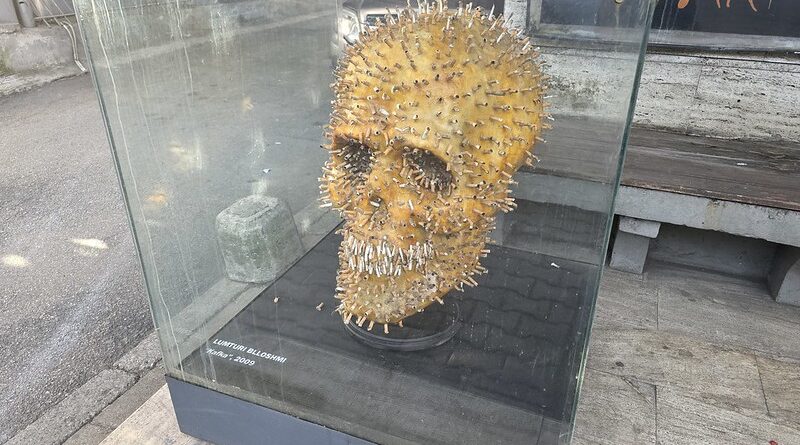 This was something of an intriguing artwork to walk past and it’s Kafka by Lumturi Blloshmi (1944-2020), created in 2009. She was an Albanian artist who was stuck working for a while under the suppression of the communist regime, but later on in her career she focused on artworks that related to the human skull. This artwork is made out of resin with hundreds of the cigarette ends which are attached to it, trying to emphasise the transience of life and the dangers of pollution. Unfortunately, she died on Covid in 2020 and she had been deaf since the age of five, so she had to contest against political repression, the limitations of the art world being mostly male and a lack of hearing. She sounds like really something of a fascinating character. There’s more information about her life at https://secondaryarchive.org/artists/lumturi-blloshmi/.