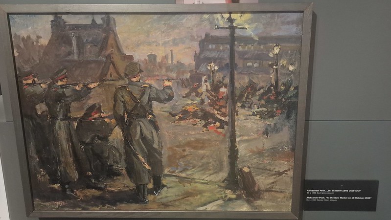 Painted by Aleksander Peek in 1966, this painting depicts the events of 16 October 1905 (or what is now 29 October due to changes in the calendar) in Tallinn (then called Reval) when a general strike had spread due to widespread dissatisfaction with the authorities. The strike had become violent and a number of those not taking part had their houses looted and burnt by a mob, who then went to the Town Hall to demand political liberties and large amounts of cash. The Mayor, who didn’t have much choice here, gave them the money but couldn’t do much about the liberties that the mob demanded. Shops were plundered and the mob got drunk and then started singing revolutionary songs as anger against the Russians continued. This wasn’t unique to Estonia either, there were uprisings across the Russian Empire which was starting to crumble.