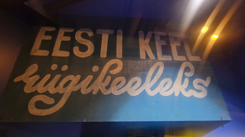 The text reads EESTI KEEL kõigikeeleks, or “Estonian as the National Language” and it was used in the mass event of the Popular Front of Estonia at the Tallinn Song Festival Grounds in June 1988. Russian isn’t much used at all now in Estonia and an example is this museum, which translates only into English. I saw very few Russian translations anywhere in Tallinn, only really in a few places with older exhibits. And children are no longer taught Russian in schools. There were some schools which taught Russian, but times are changing (https://estonianworld.com/knowledge/estonias-russian-schools-to-switch-to-estonian-language-schooling/)….