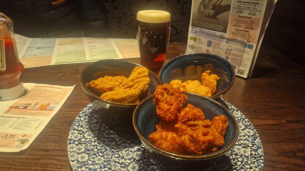 Does food get any more decadent than this? £7.49 for a selection of three different ways of frying chicken, what a time to be alive…. It all tasted as expected, was hot and the chicken was tender. The beer is the Sea Fury from Sharp’s Brewery and it’s better than I remember it, it was smooth with a malty and fruit edge.