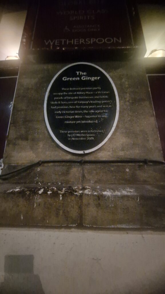 “These licensed premises partly occupy the site of Abbey Place – a Victorian parade of bespoke businesses and hotels. Slade & Sons, one of Torquay’s leading grocers had premises here and was, in early Victorian times, the sole agent for Green Ginger wine – ‘superior to any mixture yet introduced’”