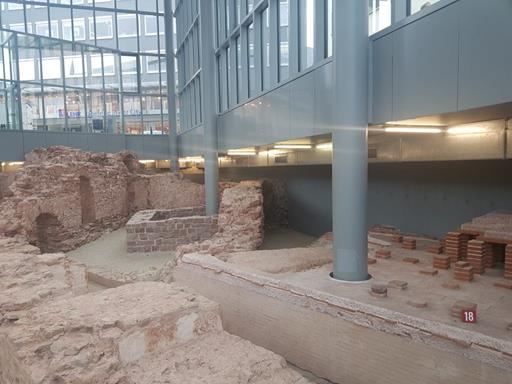The final Roman site in Trier for me to visit, which are more baths in what is otherwise a modern looking building in the middle of Viehmarktplatz (Cattle Market Square). There was an extensive set of Roman baths here, as well as a much later monastery, but the stone was robbed away, and partly used when constructing Trier Cathedral. The red line of bricks in the above photo, which crosses another red line, is the line of the old Roman road.