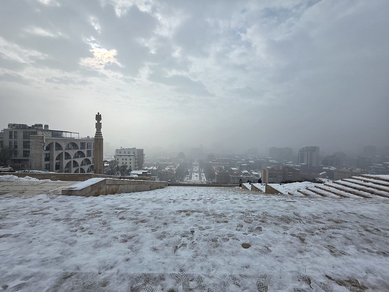 This whole arrangement is known as the Cascade and it was conceived by architect Alexander Tamanyan in the 1920s and brought to life decades later by Jim Torosyan. There are 572 steps to the top, but they were too icy and so we took the escalators.