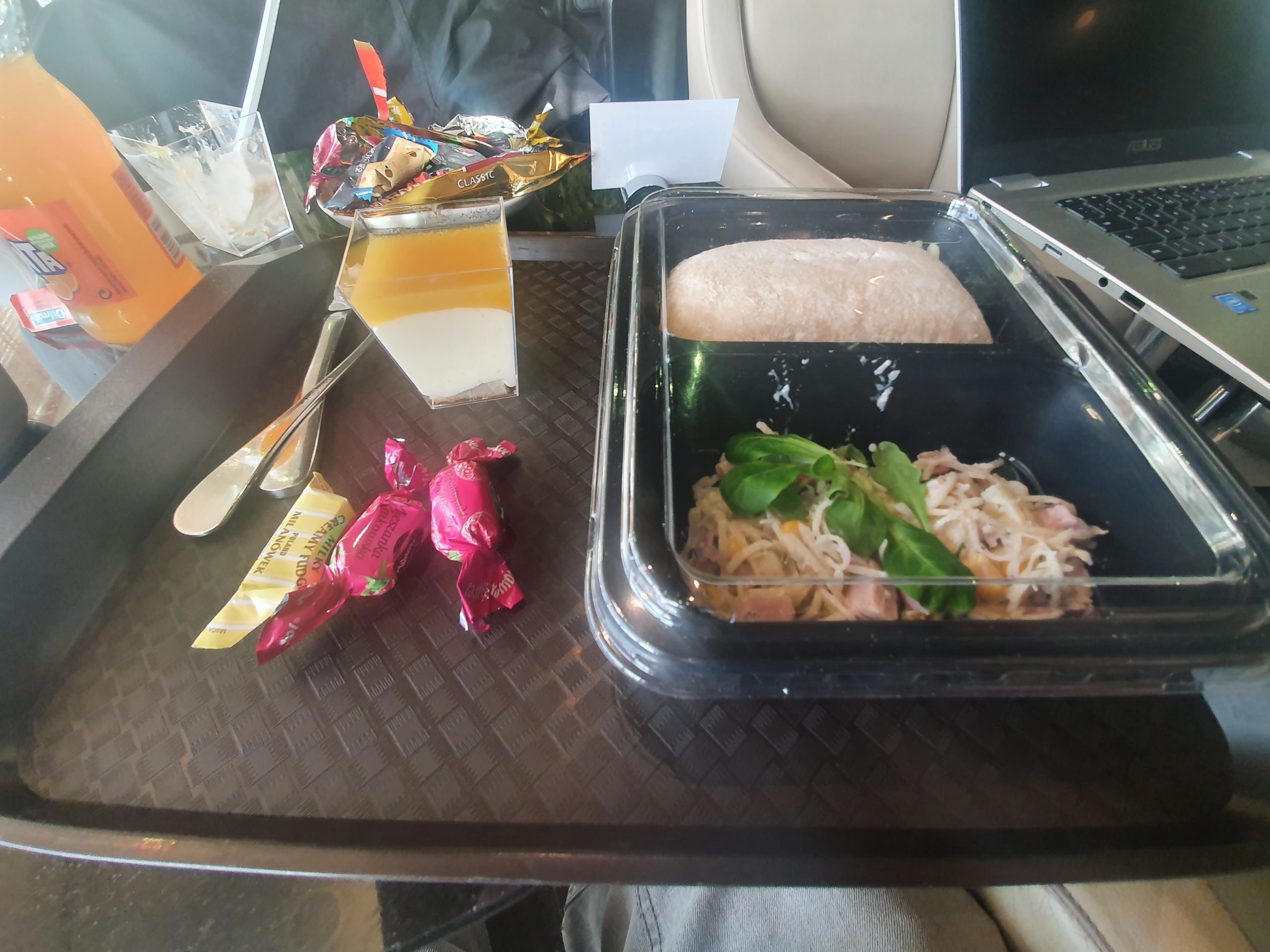 From 11.00, there is food served on trays and there’s a choice of five different meals, although it’s probably OK to get a second one. This one was the salami and cheese ciabatta, along with a salad of ham and pineapple which sounded dreadful. However, Green Eggs and Ham and all that, as the salad was really pleasant, the ham added texture as it was in little lumps (perhaps cubes sounds most tasty) and the pineapple added sweetness.