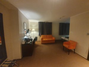 The room which the hotel had upgraded for me, which was rather lovely. There was a sofa, chairs, a large desk and a fridge, with everything being spotlessly clean.