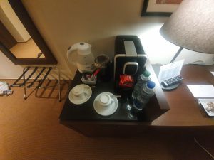 There was a espresso coffee machine, other hot drink making facilities and two bottles of water. I spent a good few minutes trying to turn the machine on, until I realised there’s a small switch at the back. And then there was espresso coffee….