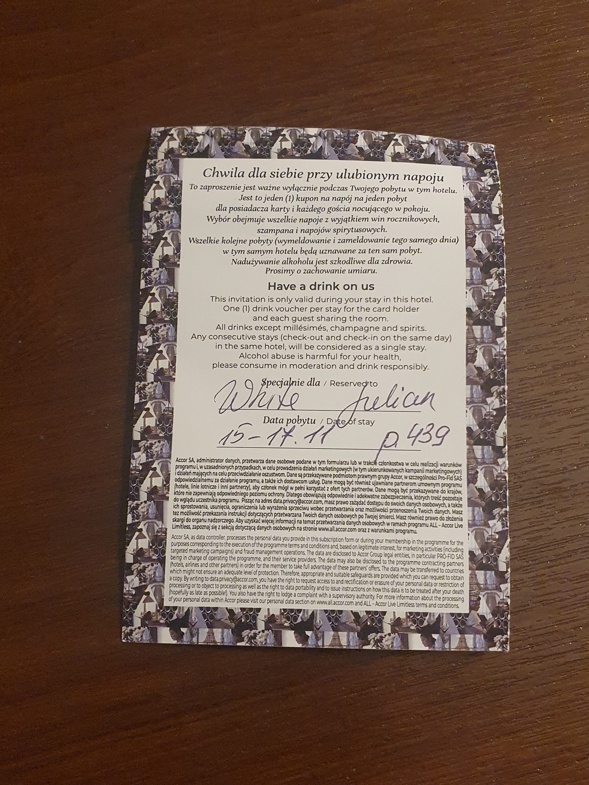 And a welcome drink voucher, which mentioned that I could have any drink, a policy which seems to vary at different Accor hotels in Poland.