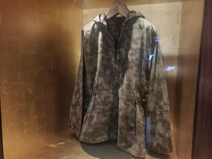 This is a tarpaulin jacket that was originally owned by the German Waffen SS when they were occupying Warsaw, but during the Warsaw Uprising the store was broken into. The jacket was given to Zdzisław Galperyn, from the Polish Home Army, battalion ‘Chrobry I’. He was captured in 1944 and sent to a prisoner of war concentration camp, but he returned to the city in 1945 and his coat was still where he left it in the attic of a tenement house at ul. Chmielna. It’s remarkable both that the individual and the coat remained intact during the Second World War, with Zdzisław donating the jacket to the museum in 2004.