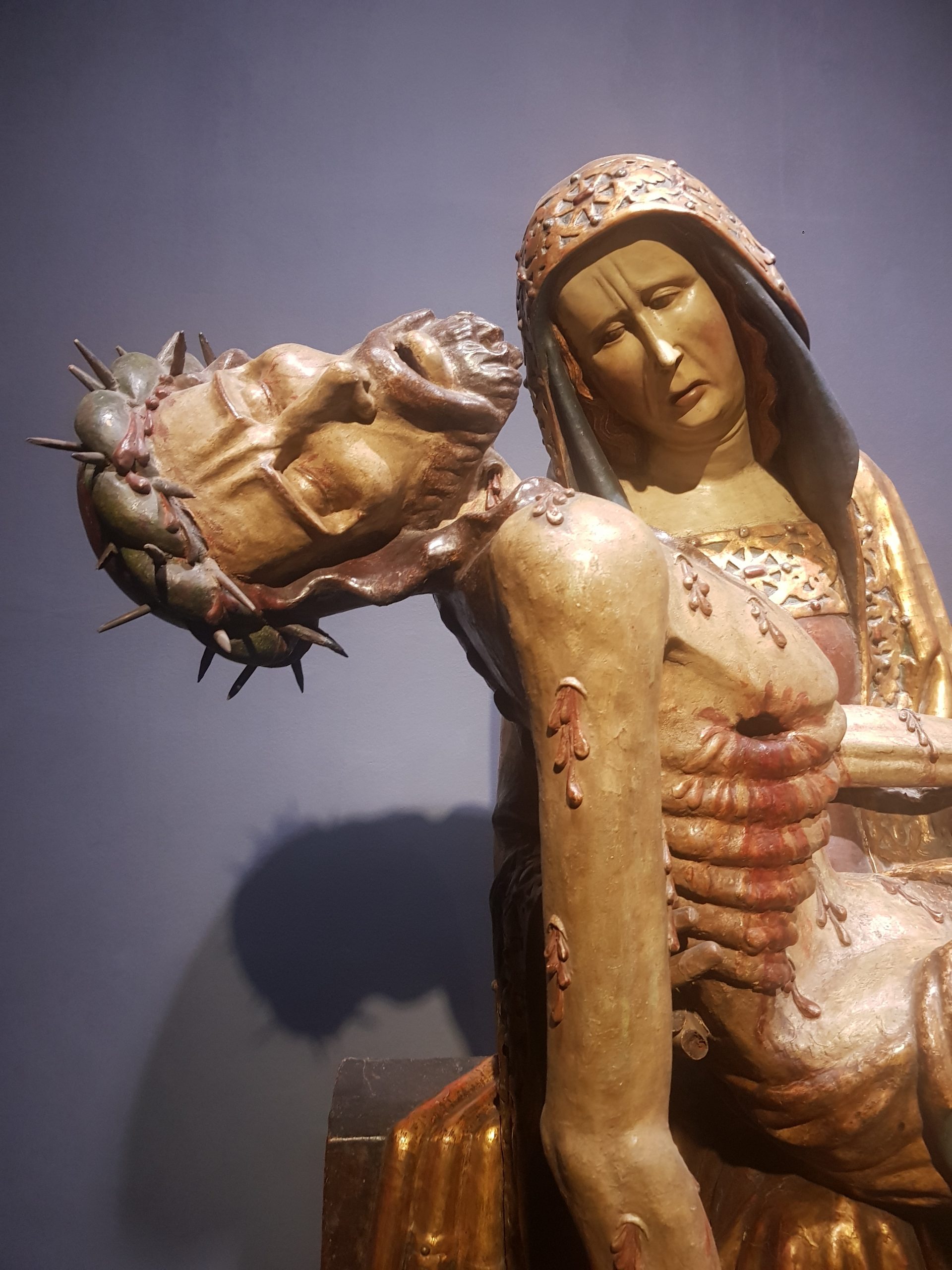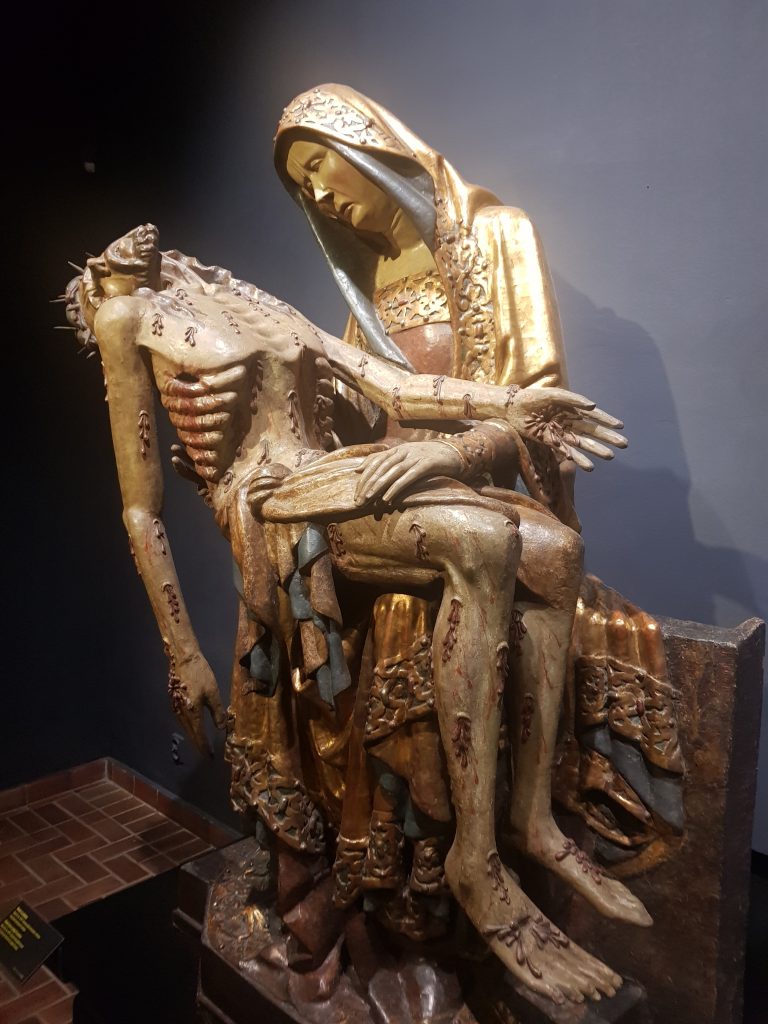 I didn’t know this before, but a Pietà is a depiction of the Virgin Mary holding the dead Jesus on her lap. It’s quite eye catching given its colour and vibrancy, with the whole polychrome item being in a decent state of repair. It’s a beautiful item and it dates to around 1370.