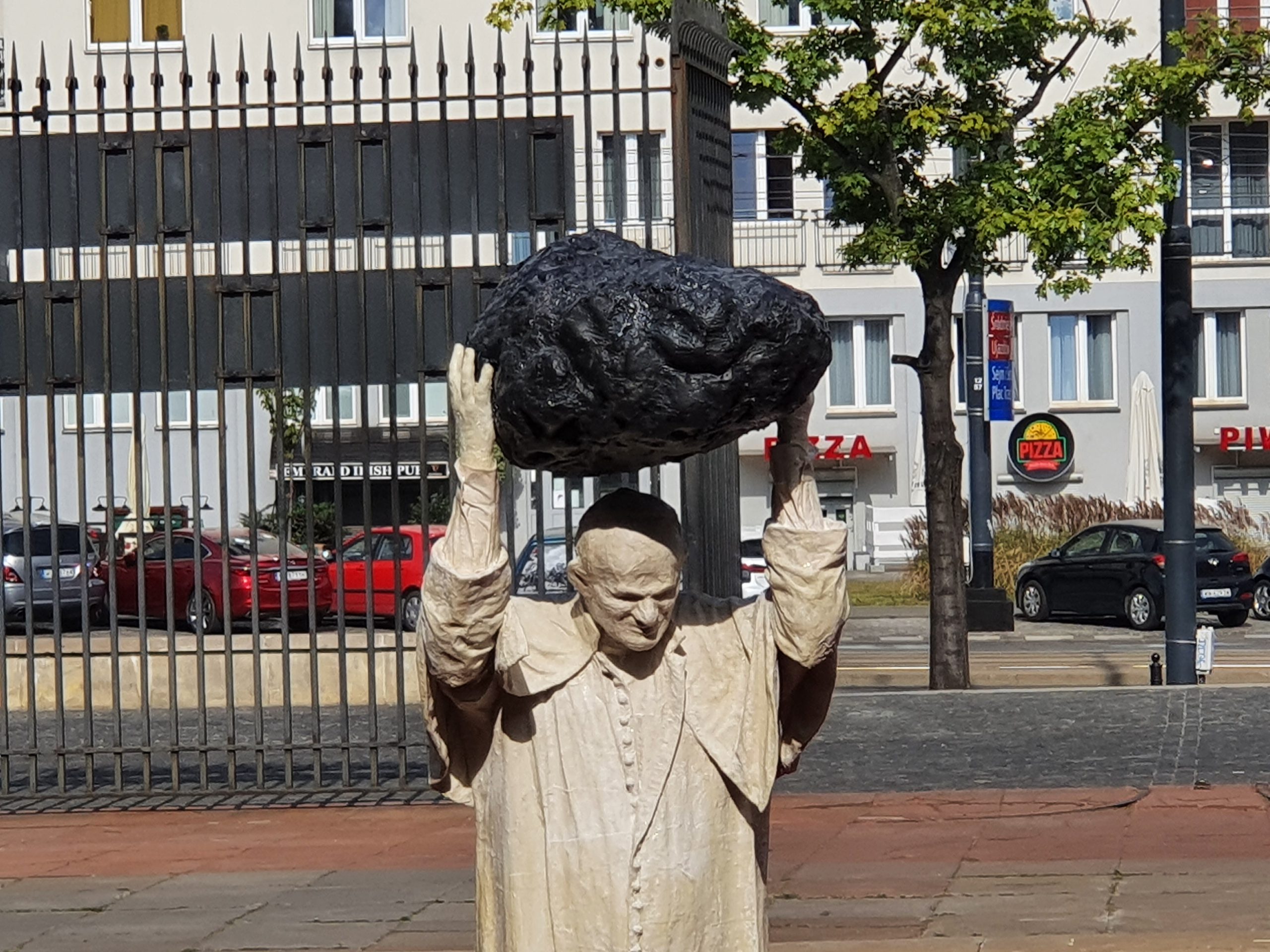 Anyway, this sculpture has been created by Jerzy Kalina and is entitled “Poisoned Source”, depicting Pope John Paul II holding a meteorite. The water has been turned red and it’s in response to an artwork by Maurizio Cattelan from 1999 which showed the Pope being hit by a meteor which had knocked him out.