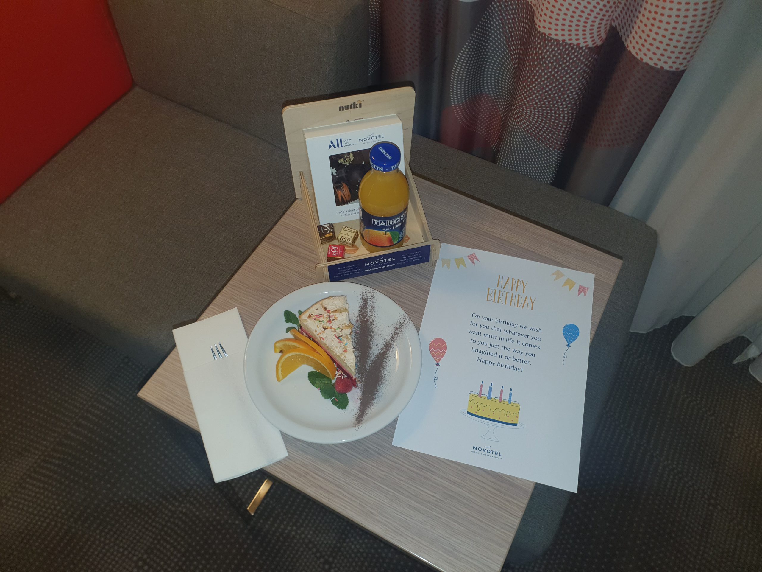 And the hotel had gone far beyond what they needed to, with a slice of birthday cake (which was delicious) and some welcome gifts and a letter. It’s fair to say that this was really rather lovely and touching. As an aside, the cake seemed to have just been placed there, and I suspect that the call made by the receptionist to someone during check-in might have been them arranging for it to be brought to the room or at least checking that it was there. Either way, this is a nice thing to see when arriving.